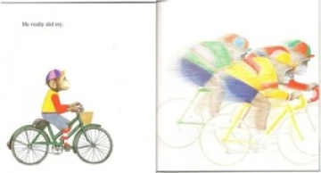 At the end of first grade the children read Willy the Champ (Browne, 2008), the story of a chimp who isn’t good at anything but defeats a big bully at the end and becomes a hero. With the book closed, the children’s comments about the illustrations after reading were much more in-depth and revealed that they were reading meanings in the illustrations in addition to the written text. One page, for example, shows Willy in a bike race that he is losing as the other bikers speed quickly ahead of him. |