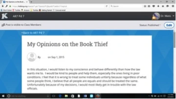 In our inquiry of Responsible Citizens, I asked my seventh graders to respond to this question: “How do you think you would act if the law dictated that you treat others unfairly?” Last year students often reacted by stating that they would not obey the law, opting instead to be sneaky about siding with what is ethically and morally responsible. Case’s thoughts reflected this when he pointed out how family safety might trump ethics: “With the law and citizens' conscience colliding, choosing a side beneficial to me and my family is important.” But other seventh graders’ insights tended to blur as we delved into the WWII era when characters’ choices proved fatal at times. As seen in the Kidblog screenshot below, Mia’s straightforward response showed her to be a risk taker. She made her decision while acknowledging the consequences and the likelihood of legal ramifications.
