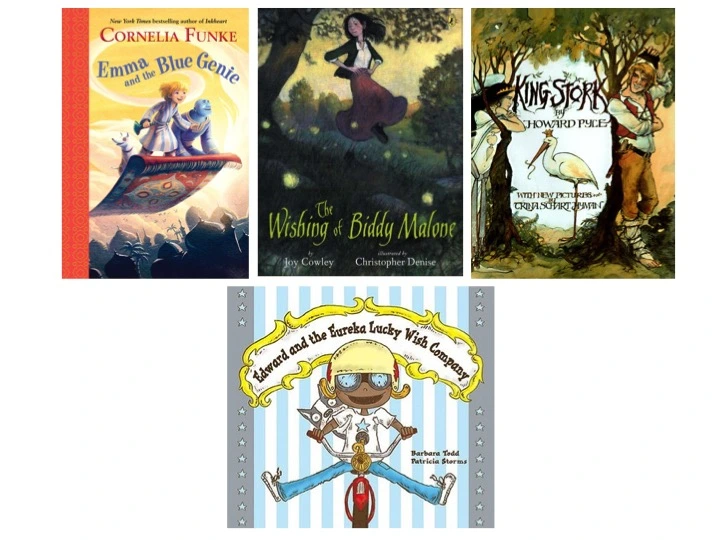 Emma and the Blue Genie by Cornelia Funke In a twist upon a genie in a bottle tale, eight-year-old Emma finds herself helping a genie who has lost his power to grant wishes. Karim lost his magic when Sahim, an evil genie, stole Karim’s magical nose ring and imprisoned Karim in a bottle. Emma decides she must help; so Emma, her, dog Tristan, and Karim fly on a magic carpet (what else?) to Barakash to outwit Sahim and retrieve the source of Karim’s magic. In return, Karim promises to grant Emma three wishes.
