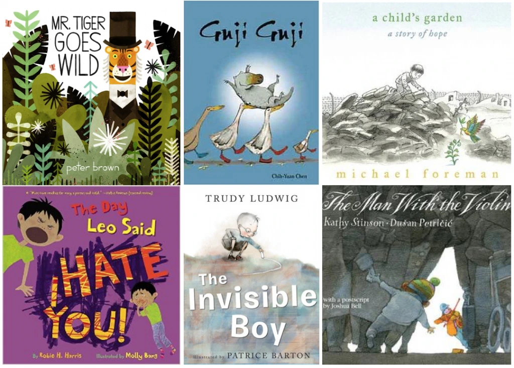 The art principle contrast is an example of a focus teachers use for minilessons. Teachers may discuss authors’ use of contrast in the personalities of characters, features of the setting, etc. In art, they might look at how the artist contrasts, for example, colors or lines. In the book The Man With the Violin (Kathy Stinson, 2013), artist Dusan Petricic uses contrast by representing the sounds of a violin with flowing wavy lines and the sounds of people talking with jagged zigzag lines. Children come to understand ways of symbolically representing sounds on paper. Other picturebooks we use to highlight contrast while children read in Storying Studio include Guji Guji (Chin, 2004), The Invisible Boy (Ludwig, 2013), The Day Leo Said I Hate You! (Harris, 2008), A Child’s Garden (Foreman, 2009), and Mr. Tiger Goes Wild (Brown, 2013). Next week, I’ll explain how children explore what they learn in minilessons.