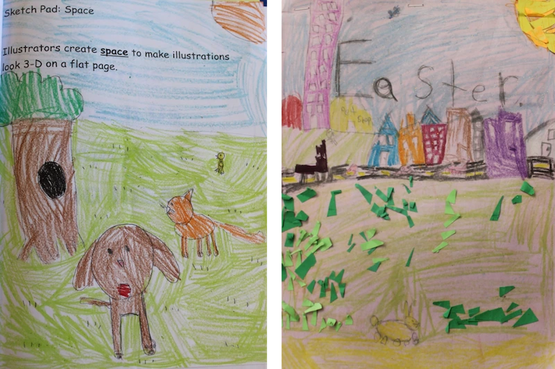 When children STORY in Storying Studio, they utilize what they’ve learned in minilessons to compose their own picturebooks. Figure 1 is an example from Marcie. On a page from her Sketch Pad, on the left of Figure 1, she uses the art element of space during EXPLORE. Space refers to how artists add depth and give a “3-D” effect on a two-dimensional surface. Marcie uses foreground, middle ground, and background; proportional change in the size of the animals; and, overlapping of the tree on the ground.