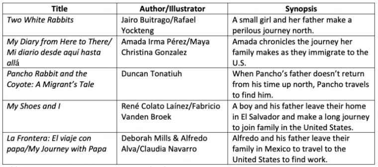 Children's Books Cited Buitrago, J. (2015). Two White Rabbits. Berkeley, CA: Groundwood. Colato Laínez, R. (2010). My Shoes and I. Honesdale, PA: Boyds Mills Press. Mills, D. & Alva, A. (2018). La Frontera: El viaje con mi papa/My Journey with Papa. Cambridge, MA: Barefoot Books. Pérez, A. I. (2002). My Diary from Here to There/Mi diario desde aquí hasta allá. San Francisco, CA: Children’s Book Press. Tonatiuh, D. (2013). Pancho Rabbit and the Coyote: A Migrant's Tale. New York, NY: Abrams.