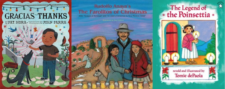 There is a larger set of Christmas books with Latinx main characters, beginning with the well-known Too Many Tamales by Gary Soto and illustrated by Ed Martinez. Originally published in 1992, this realistic fiction picture book tells the story of Maria, who loses her mother’s diamond ring while making tamales on Christmas Eve. The cultural tradition of making tamales at Christmas time will be familiar to many Latinx children while many other children will be able to relate to Maria’s misbehavior and the gathering of a loving, extended family. Two other older picture books provide explanations of Christmas traditions. Published in 1994, The Legend of the Poinsettia by Tomie dePaola retells a Mexican legend of how the poinsettia flower came to be associated with Christmas. The Farolitos of Christmas by Rudolfo Anaya and illustrated by Edward Gonzales, published in 1995, is historical fiction account of how a little girl invented farolitos, a New Mexican tradition of turning paper bags, sand, and candles into lanterns that decorate houses and light pathways at Christmas time.