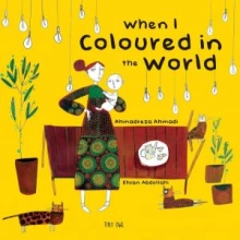 In a natural book pair, Iranian author Ahmadreza Ahmadi uses short poems to highlight an emotion and color describing what children would do to return peace and happiness to their world. The poems are illustrated in vibrant colors by Iranian illustrator Ehsan Abdollahi. Each page in When I Colored In the World takes on one problem, and the child narrator erases out the problem, replacing it with a color and something that changes the world. For example one page says "Hungar / I rubbed out the word hunger. / I wrote wheat with my green crayon. / Green / Wheat / I made wheat grow in fields all over the world. / I gave the world green." The final page expresses my hope. "Despair / I rubbed out the word despair. / I wrote hope with my yellow crayon. / Yellow / Hope / All over the world children smiled. / They ran into the fields and up the hills / looking at the beautiful new life growing all around."