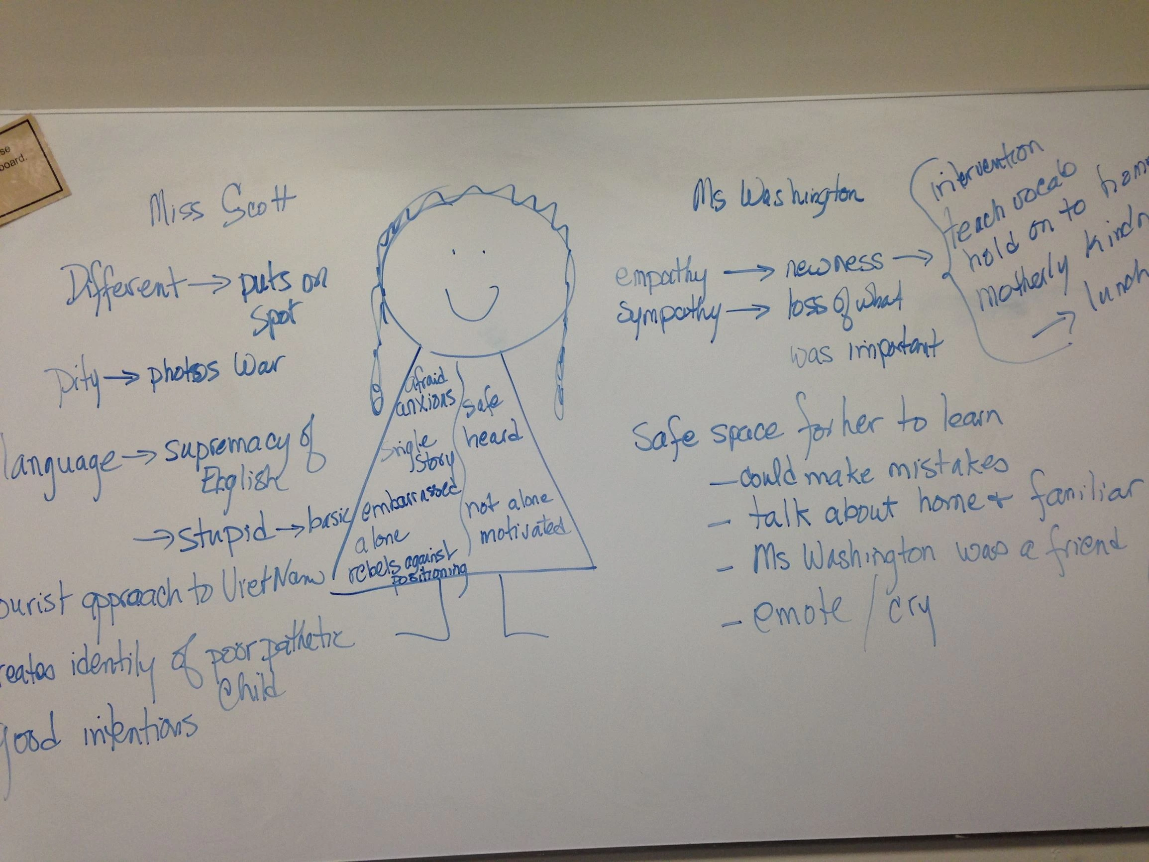 In my classes for K-12 pre-service teachers, we start by talking about the story, then we begin to look deeply at the characters. We create a three-part cultural x-ray of 10-year-old Hà, looking at the values and beliefs that motivate her actions. Then we add a section to the right and the left of our portrait of Hà, and begin to list the actions and perceptions of her teacher Miss Scott (MiSSS SScott) and her neighbor Mrs. Washington (MiSSSiss WaSShington). As we look at what motivates these women's very different actions, students begin to understand the cultural backgrounds of Hà and the two women who are trying to help her learn and adjust. Students change as we look at Miss Scott's misperceptions and Mrs. Washington's compassion. In the process, refugees become people instead of a feature on the news. More importantly to me, students begin to understand the arduous journey of immersion into another country and language.