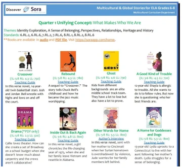 This is a list of books that are available both in audio and ebook formats in Sora that our district developed to share with Grades 6-8 teachers and students. Unifying concepts and themes and topics of our district curriculum maps, reading interest and lexile levels, teaching guides for each title, and Arizona State Standards (ELA) are added to the list. This helps teachers with incorporating audiobooks and ebooks into teaching.