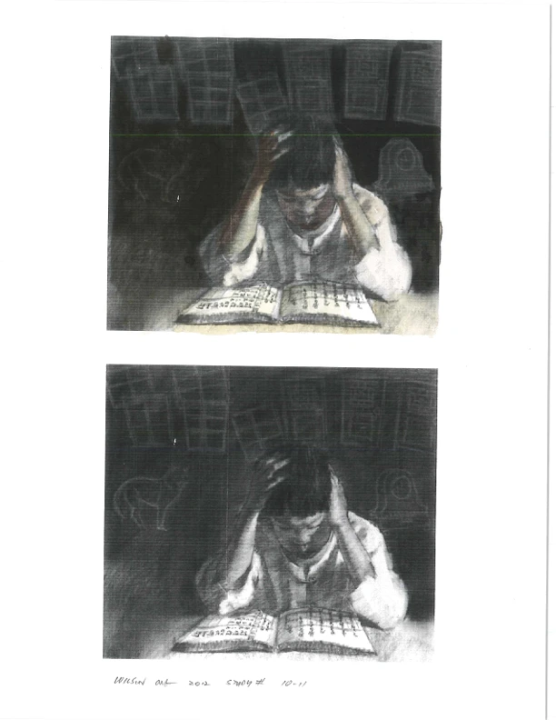 Wilson was provided a script for the book where the designer had already taken the written manuscript and divided the text into pages, so his first step was to make thumbnails and a story board of possible illustrations and send them to the editors. Upon approval, he then moved to the actual drawings, arranging for models to be photographed and using the sketches as a guide. He asked his wife and two brothers that he had met during one of his daughter's piano lessons to pose as models to photograph for particular scenes and used old photographs of his grandmother. Using these resource materials, he drew each illustration on canvas in charcoal and submitted the images to the editor. After approval was granted, he photographed and printed out the charcoal drawings and used the copies for color studies to create a flow of colors from page to page. At this point he was ready to complete the illustrations by painting over the charcoal drawings in oils. He created a thin layer of oil paint over the charcoal drawings on the canvas so that the paints would dry quickly because he had so many illustrations.