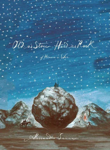 Old as Stone, Hard as Rock of Humans & War begins with a short poem written by Giuseppe Ungaretti (1916), a World War I veteran, entitled, "I Am a Creature." An author's note follows in which Sanna explains how this poem inspired his creative journey in exploring the story of humans and war. He allowed his hands to depict what his mind could not express in words. The introduction written by Ammiel Alecaly follows the author's note. Alcalay, a poet and writer, philosophically reflects on Sanna's amazing illustrations stating that "hands are human, capable of creating and destroying." Alcalay then describes Sanna's illustrations of the progressive emergence of forces of destruction beginning with the first murder committed with a stone and then progressing to the use of spears, arrows, cannons, planes, bombs and missiles. This introduction serves as a way for the reader's mind to prepare for the emotional visual journey awaiting at the turn of each page.