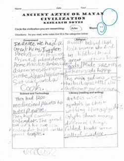 The students were then asked, “What evidence can you discover to show that the Mayans or Aztecs had a civilization?” As they began independent research, the students practiced categorizing information as they recorded their findings on a graphic organizer. To build note-taking skills, Ted led the class in frequent practice sessions, using excerpts from the text set. The students used the information they had gathered and evaluated their notes when they were asked to select three important ideas write about and illustrate on a pyramid.