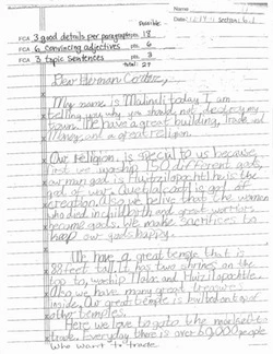 In language arts, they explored persuasion, point of view, and audience by writing a letter to Cortez in the role of an Aztec or Mayan person. They wrote to convince Cortez not to destroy their civilization, using the text of their own notes as evidence.