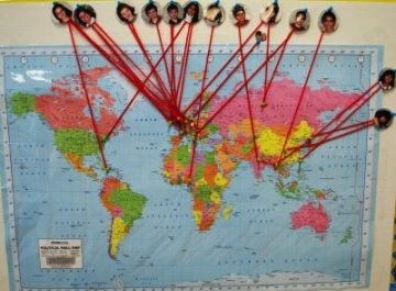 We began our exploration of children’s intercultural understandings with a focus on identity/self-awareness. As Banks (2004) states, “Self-acceptance is a prerequisite to the acceptance and valuing of others” (p. 302). To help the children begin to explore who they are and their family heritage, the teachers asked the parents to complete a survey about where/when their families immigrated to the United States. We wanted all of the children to understand that while some of their classmates moved here recently, all of their families, unless they are Native Americans, originated in another country. While conceptually this was difficult for young children to comprehend, it was a way to help them begin to develop global awareness. The teachers plotted the survey information on a world map in their classrooms, attaching a string from a picture of the child on the outside of the map to their country of origin (when children had multiple countries of origin there were multiple strings). The children took pride in putting up their string and naming their country. Throughout the year the teachers at times referred to the maps to reference where particular global picturebooks were from or the location of a certain place. The photo below is an example of one of the maps.