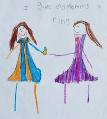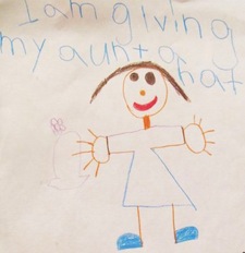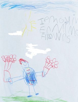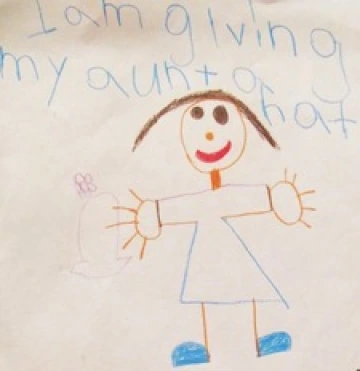 In response to Carolina’s Gift, the children drew and wrote about what they would like to give their family members. They talked about giving such things as flowers, Girl Scout cookies, a game, and a bull dog to their mothers, brothers, sisters, and fathers. In her drawing, Alisa chose to give her aunt a hat with a flower, connecting to the part of the story that mentioned that in Peruvian culture hats are worn by unmarried women. Alisa so well grasped an understanding of the custom that she made a connection to her own family. Monica drew herself with her mother and wrote, “I give my mommy a ring.” Jacob drew himself carrying flowers and wrote, “I’m giving my mom flowers.” Both Monica and Jacob included patterns on the clothing in their pictures, picking up on the patterns they saw in the story.