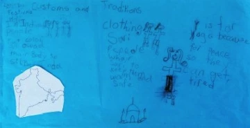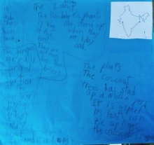 Our last text set was Land, Resources, and Animals. In this set we read books like I is for India (Das, 1996) and India the Land (Kalman, 2010). My students found it interesting that the ears of Indian elephants are in the shape of the country, with the Arabian Sea on the west and the Indian Ocean on the eastern side. They were also interested in learning about the Himalayan Mountains and the Ganges River that begins there and flows 1,557 miles to the Bay of Bengal. My students were curious about the sacred importance of water in the religious beliefs of the people. They asked many questions about the celebration of The Khumb Mela in the Ganges as well as the custom of scattering the ashes of cremated relatives there. Joshua's graffiti notes for the Land, Resources and Animals text set are below.