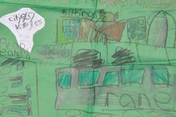 He noted that people eat on the ground, drew different types of buildings, and identified some different forms of transportation.
