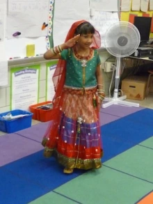 Leah performed a fusion of Folk and Classical Indian dance. She wore a brightly colored costume called a Lehenga Choli. She wore many bangles and had a bindi (jeweled decoration) on her forehead. She danced to a joyful Indian folk song and used a dandiya (colorful stick) to enhance her movements. Her mother explained that some types of dance are deeply religious and some are done on happy occasions. Here is a short video of Leah's dance: