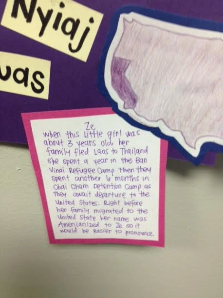 When the little girl was about 3, her family fled Laos to Thailand, she spent a year in the Ban Vinai refugee camp, then they spent another 6 months in Chai Cham retention camp as they awaited departure to the United States. Right before her family migrated to the US her name was changed—Americanized—to Ze (see Figure 6), because they believed it would be easier to pronounce.