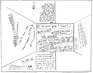Although we had planned for this whole group discussion to be a short sharing from each small group about their focused question, the students instead engaged in dialogue with each other about issues that were continuing to trouble them. Students asked and answered questions, made connections to the real world, and built on each other’s comments. Sometimes students were confused as to the facts about race relations and historical contexts but the one overriding big idea that kept coming up was the fence as a symbol for something that divides us. The emergence of this symbolic theme was exciting to me as a teacher. The kids were thinking deeply and in symbolic ways using figurative language to express what they were thinking. It was exciting to see this happening before our eyes and it was all the more important to us as a team to know that the kids were constructing their own meaning, not being “spoon fed” standards from an adopted curriculum.