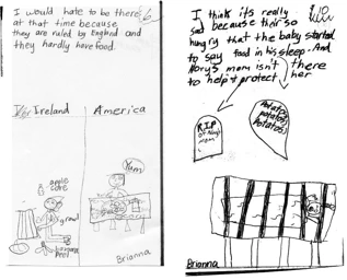 Students had small literature logs to respond in after each read aloud. They responded through writing their thoughts and questions or sketching for five minutes and then we discussed the book as a class. At the beginning of the book their responses were narrow and surface-level. In their logs, I saw entries saying that “Nory has a friend named Shawn,” or “Nory’s dad went fishing.” Students were just skimming the surface of the book to note information but not trying to understand the characters and their situations. They were bored by the idea of this young girl starving in Ireland because they didn’t believe that it could happen or thought it was a problem that could be easily solved. One student asked, “Why didn’t the U.S. go help them?” Students saw the U.S. as having a mission to go into other countries and save them from their problems. They wanted to know why no one went to the aid of the Irish and why England would continue to charge rent to starving people and throw them out of their homes. It seemed strange to them and these tensions led them to become a little more engaged in the book.