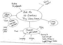 To provide yet another point of view and further their thinking in the classroom, I read aloud Ask Me No Questions (Budhos, 2006), the story of a family who emigrated without documentation from Bangladesh and were living in New York City at the time of 9/11. Suddenly, their world shifts and they find that being Muslim has become synonymous with being a terrorist. A Homeland Security law requiring Muslim men over the age of 18 to register leads them to flee the U.S., but their father is detained and jailed at the Canadian border because his visa has expired. The story highlights the tensions between two teen-age sisters, their struggle with prejudice, and their quest to become citizens as they try to get their father released. Teachers at their school ask no questions even when Aisha’s college plans fall apart due to their immigration status. In class we talked about what it would be like to be Nadira and Aisha as outsiders living in another country and being viewed with suspicion while trying to fit in. Through their discussions, students explored many ideas about the meaning of the story including not judging someone by how they look, taking risks, not giving up hope, fear, and fitting in. The simulation in the lab had forced kids to take the perspective of an outsider. This novel forced them to look at the same situation but from the perspective of someone living in their country, giving them greater insights into the issues of immigration. These perspectives are evident in the web of the big ideas they identified from the book and their sketch to stretches of the meaning of that book. In these sketches, they used visual images to symbolize the meanings that were significant to them from the book and our discussions.