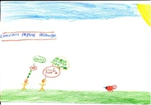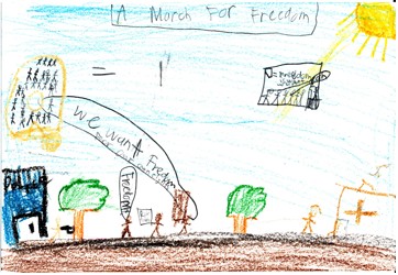 Kaye (2004) argues that engaging students in these kinds of experiences is essential to creating an understanding of democracy. “When young people recognize their vital role in improving society, working for social justice, and caring for the environment, then they truly understand the concept of democracy. Students recognize how participation and the ability to respond to authentic needs improve the quality of life in the community, which may lead to a lifelong ethic of service and civic participation” (p. 13). Students were taking action for the greater good and through that experienced the importance of participating with others to improve a difficult situation. One way in which they demonstrated this understanding was to create sketch-to-stretch images to visually symbolize what taking action meant to them.