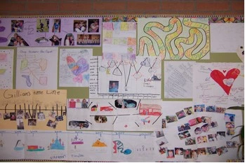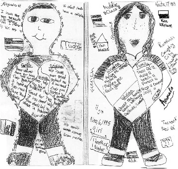 Literature can encourage students to focus on themselves as cultural beings in order to go beyond the typical “Who am I?” activities. We read aloud and discuss picture books in which the characters struggle with their identities, such as You Be Me and I’ll Be You (Mandelbaum, 1990) and Cooper’s Lesson (Shin, 2004). Students have responded to these books by exploring their cultural identities in different ways, such as drawing memory maps of their neighborhoods to identify stories from when they were “little” and mapping significant events in their lives on Life Journey Maps. They also created Cultural X-Rays in which they labeled the outside of their bodies with aspects of their culture that are evident to others, such as language, age, ethnicity, gender, and religion, and the inside with the values and beliefs that they hold in their hearts. These Cultural X-Rays were created by students in Amy Edwards’ fifth grade classroom.