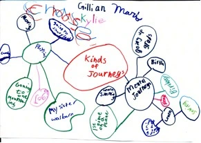 The older students were asked to work in small groups to create a web of the kinds of journeys that they saw on their life journey maps. To accomplish this, they need to think across their Life Journey Maps and create categories and connections.