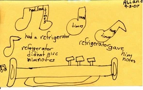 Sketch to Stretch is challenging for children and often more so for adults, who frequently draw an illustration of the story rather than a connection to their thinking about that story. We found that it is helpful to show examples. I shared a Sketch to Stretch that I had created in response to a book that we had read in a previous session. I talked about how I thought about an important idea from within the story and then sketched images to represent the idea. I intentionally left my sketch unfinished and invited the students to suggest ideas that might make my sketch clearer. When they seemed to grasp that they could use color, shape, design, symbols, words or equations to represent the meanings of a text, I read a new story and asked everyone to show their thinking about the meaning of that story using Sketch to Stretch.