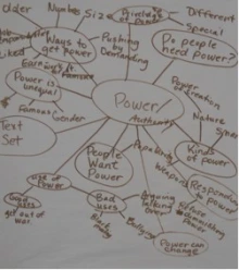 We used a big idea that was represented across the webs from the different intermediate classes to demonstrate how to identify the issues around a big idea. Power was a big idea that many students identified in their reading. I wrote power in the center of a piece of chart paper and asked the kids to help me think about the issues that we encounter in our world related to power. I told them that when I think about issues in our world, I am often thinking about what is good, bad, fair and unfair about that idea. We all deal with issues related to power in our lives. Children have lived with and have strong feelings about the issues related to power as well. We webbed their responses about what they saw as good, bad, fair and unfair about power.