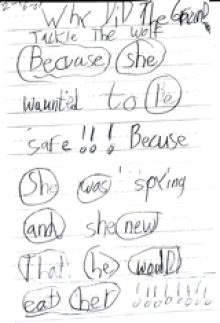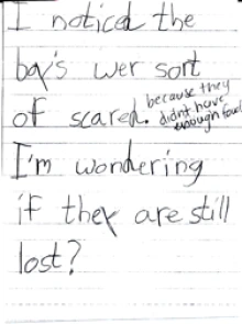 We provided students with time to do investigations through opportunities to problem-solve and explore their wonderings in more depth. At the end of the week, we asked the kids to review their wonderings and choose one that resonated with them and that they wanted to explore further. We offered several possibilities to give them an idea about what we meant by choosing something to explore. In the group I worked with, we created a chart of their wonderings from which they could choose an investigation. Some international variants of Red Riding that we read don’t depict her as having parents and many kids were intrigued by this. Others wondered why the setting was always the same. They were also interested in the different emotions of the wolf. We left the projects open ended, but did introduce several different mediums and processes they could use. Some possibilities for the first projects included drawing your wonderings, using drama to express your interpretations or blocks to build your thinking, and writing letters to the author asking them why they made particular choices.