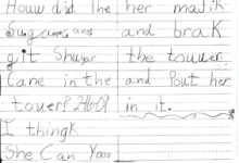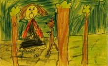 Demonstration is the part of the cycle where teachers offer support in the students’ investigations and this was the area we knew we had to revise for the kids to get the most out of their investigations. The following week we had a new group of kids exploring a new set of fairy tales but, as teachers, we each stayed with the same fairy tale to help strengthen our skills and knowledge of the stories. Doing it this way allowed us to compare and contrast the students’ engagements and wonderings in each group. After working with these stories for a week, we put the kids together and talked about what they noticed that all the stories had in common. We also asked them to think about questions they might investigate further. This seemed to make it easier for the kids to think about the stories and choose a question to explore. While thinking about the Little Red Riding Hood stories, Abby was intrigued with Little Red Riding Hood: A Newfangled Prairie Tale (Ernst, 1995) and explored the question, "Why did the Grandma tackle the wolf?" by using her background knowledge and inferences. Her interpretation was that grandma simply wanted to be safe and so was spying on the wolf and knew that he would eat her. Abbey A. was curious to know how Sugarcane got in the tower and explored that question using her knowledge and inferences as well. She thought that the sorceress, Madame Fate, used her magic to break the tower and put her in it. Giving them adequate time to engage in dialogue helped them think about their investigations with more depth. Jaquetta and I felt that having the opportunity to reflect on what the stories had in common and choosing a question to investigate produced more thoughtful, meaningful representations.