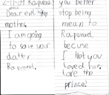 Throughout the study we continued to think about emotions the characters took on in the stories and really delved into perspectives as a way to think about others. Our response logs gave the kids that needed opportunity to pull back and reflect on their learning. It is these opportunities that fill the re-vision part of the inquiry cycle. We introduced our kids to letter writing and challenged them to push themselves in their self-reflection time by taking on the role of a character and writing a letter to another character using emotion. It was at this point in our study that we saw the kids become engaged and transfer their thinking to other content areas. The kids showed such emotion and conviction in their letters. Cory took on the role of the prince and wrote to the Evil Stepmother in Rapunzel telling her he was going to save her daughter Rapunzel and she better stop being mean to her because he thought she loved her.