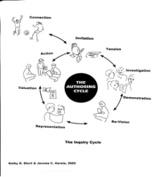 Jaquetta Alexander and I had been team-teaching first and second grades and we knew moving into an inquiry study with 60 students was going to be a challenge but we were up for it. We had recently been to NCTE in San Antonio where we listened to Brian Edmiston talk about dramatic inquiry with fairy tales and young students. We were intrigued and excited about bringing fairy tales and inquiry into our classroom. We knew we needed a framework, something to provide a bigger picture for our work, and in our study group we were re-introduced to the inquiry cycle, an authoring process where learners engage in authoring or constructing meaning about themselves and the world (Short, 2009). It was this framework that set up our work with fairy tales.