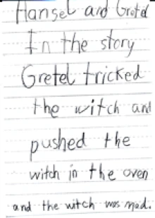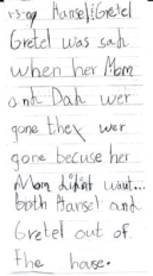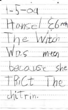 Not only did we discuss the read aloud as a class but we felt it was important for kids to have an opportunity to self-reflect on the story and make connections and noticings. We introduced them to their response logs, a place for them to do their own thinking and writing about the fairy tales. Abby wrote about how Gretel was sad when her mom and dad were gone and then went on to explain why they were gone. We had been pushing the kids to explain their thinking in order to go beyond what they thought and explain the why. It was encouraging to see the kids attempt this. Not only did Abby take the challenge but Cory did too when he talked about how Gretel tricked the witch and pushed her in the oven and because of that the witch was mad. Abbey A. used the important "because" to describe why the witch was mean. We knew we were headed in the right direction and continued to focus on giving the kids time to reflect and connect to the fairy tales we were exploring.