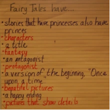 After being introduced to the five fairy tales we felt it was important for the kids to define a fairy tale so they could refer back to their definition throughout our study. We made a chart of the things they had learned about fairy tales and what they noticed as characteristics across them. They shared that fairy tales have: