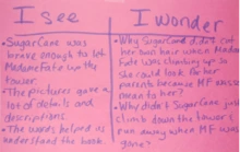 In our study group, Kathy had mentioned how a teacher in the younger grades had used a t-chart to support kids’ thinking about what they saw in a story and what left them wondering. Jaquetta and I thought this sounded simple enough for our kids but we also wanted to invite them to think thoughtfully about the story. Kids naturally would come up with an "I See" and automatically share an "I wonder" that was closely related to what they saw. An example can be seen in Jaquetta’s groups chart for Sugarcane (Storace, 2007) where a student shared that Sugarcane was brave to let Madame Fate climb up the tower. But on the flip side the kids wondered why Sugarcane didn’t cut her own hair instead of letting Madame Fate climb up the tower.