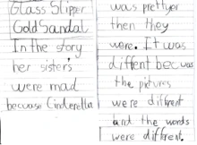 In conjunction with thinking and recording what they saw and wondered about the fairy tale the kids were also reflecting in their response logs on what they thought about the story. The use of response logs were used throughout our study. Abby began in the Rapunzel group and wrote about why Rapunzel was sad, giving details and using that important word "because." Cory was in the Cinderella group to begin with and his responses were awesome -- he was not only talking about why the stepsisters were mad at Cinderella but he compared the Cinderella we had heard during our first week, a European variation, to the one Jill read to them, an international variant goes across cultures, Glass Slipper Gold Sandal (Fleishman, 2007).