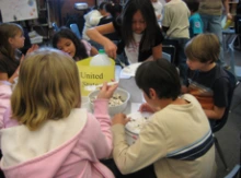 We intentionally planned the banquet early in our study to provide students with a reference point for thinking about hunger in our community and world. To include everyone in the school, we planned two separate banquets. At each banquet, approximately 100 first through fifth graders filed into the library, anticipating the global feast we had been talking about all week. All the children knew was that an announcement was sent home, saying that they would be eating the way the world eats and that any contributions to support the feast would be greatly appreciated. Some students were concerned that they might be forced to try foods that they didn’t like while others looked forward to a special meal in the middle of the morning.