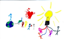 Following the feast we moved into engagements that allowed students to think deeply about the range of causes for hunger. We personalized the issue for students using stories, videos, and guest speakers as well as provided them with a range of nonfiction resources that provided facts and statistics. As our study progressed, students made reference to the feast over and over again. They associated the experiences of characters in the stories they read with the group colors and referred to the big numbers that remained posted in the library during their discussions and refections. When asked to create a sketch to stretch of her understandings about taking action at the conclusion of our study, Elizabeth drew red, yellow, and blue people to express her thoughts about the need for everyone (red, blue, and yellow) to work together to help the hungry, as well as the need for a caring heart and ideas about the causes of hunger.