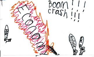 We read Tight Times (Hazen, 1979) about a family who is experiencing difficult financial problems and discussed the choices the family has to make between wants and needs. Students created flow charts that showed the consequences of tight times. They learned that hard times can bring hope for a better future as well as sadness and the loss of hope. Students engaged in Sketch to Stretch (Short & Harste, 1996), using visual images and symbolism to explore their thinking about what can happen to a family during tight times. In his sketch, AJ shows the economy crashing, writing on the back, “My picture is explaining the economy crashing. The people represent the U.S. The one flying means some people get hit harder.”