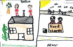 Arianna’s Sketch to Stretch shows a family happily in their home in the before picture and the same family on the street holding a sign that says “Need money” in the after picture. Arianna writes, “What I did is a before and after which means maybe you can be really rich one day, then some day else you can end up homeless.”