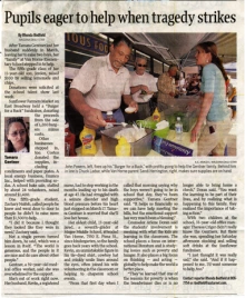 As others at the school worked to contribute to this family, these efforts snowballed into a major event. The local natural foods store held a fundraiser for organizations once a month on Saturday called “A Buck a Burger.” A BBQ was held in the parking lot and members of an organization could buy supplies at cost and take whatever profits they made from the sale of the burgers. The store had never done a benefit for just one family but they were willing to help. The school had to supply tables, chairs, awnings, condiments, paper products, and labor. The market supplied burgers, lettuce, tomatoes, onion, and the grill at cost. We also held a bake sale in conjunction with the BBQ. It was a whole school effort and successful as 1500 hamburgers were sold that day. The newspaper covered the event and as a result of telling this family’s story, the mother was offered a job. Students participated by helping out but this event was organized by adults in our community.