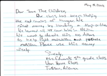 In my classroom, students were still thinking about hunger and ways to take action. They decided to hold a Map-A-Thon and collect pledges from sponsors to pay for each correct country they could identify on the continent of Africa. Initially, the money they raised was to be contributed to Save the Children. In retrospect this fundraiser was much less significant and the students only raised about $100, with me kicking in $11 to round out the donation. In discussing the practicality of adopting a child, we went back to the Web site and saw there was another way to donate that made more sense. They chose to make a onetime donation that would go towards nutrition and medicine for needy children. They wrote a letter to the organization and we sent off the check.