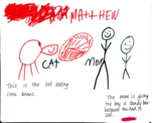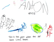 Retellings can sometimes demonstrate parts of the story that the students thought were funny or humorous. After hearing The Book of Mean People by Toni and Slade Morrison (2002), Nicholas responded to the part of the story when the character, a bunny, takes off his clothes. When asked about his drawing, he said, “I liked the part where he took off his clothes and stretched because it was funny.” Similarly, after the read aloud of Tight Times (Hazen, 1979), Anton responded by depicting a humorous part of the story. He drew a cat eating lima beans and dictated, “This is the part when the cat likes lima beans.”