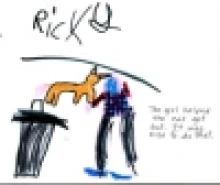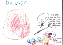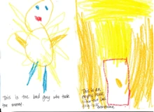 In some cases responses that are retellings can be narratives of the main point of the story. LaFon Phillips (1999) argues that students can create retellings through narratives and storytelling (p. 368). In many cases the dictations I was taking from students were narratives that they created to explain their thinking about the story. Not all of the narratives were long and involved; they ranged from one to three sentences. For example, after reading The Book of Mean People, Sarah drew a picture of a sad boy. She dictated the following sentences that narrated her understanding of the story, “This is a picture of the boy being sad. Someone was mean to him.” These simple sentences tell the main point of the story. Another example of a narrative retelling is Zachary’s response to Peach Heaven (Choi, 2005). He drew a picture of the girl standing with peaches and said, “The girl was smiling because she was kind of happy. She was kind of happy because it was raining peaches and she was sad because the farmers worked so hard.” Zachary demonstrated a sound understanding of the big idea of the story through his retelling as well as comments on both the villagers’ and the farmers’ perspectives.