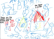 Many of my students responded to stories by recounting an event from the story. These retellings were straightforward and literal. The events that the students depicted were not events that were not necessarily central to the story plot. They were details of the story that they remembered. For example, after hearing Tight Times, by Barbara Shook Hazen (1979), about a family experiencing difficult financial struggles, Matthew drew a picture of the cat eating lima beans and the mother in the story giving the son a candy bar when his father is upset. He dictated, “This is the cat eating lima beans. The mom is giving the boy a candy bar because the Dad is sad.” Cherise responded similarly to Smoky Night, by Eve Bunting (1997), about riots in Los Angeles. Cherise drew a picture of a house burning and the church that served as a shelter. When I asked her what she was drawing she said, “This is the fire on the house. This is the church that the people slept at.”