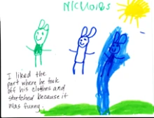 Neither Nicholas nor Anton responded to a central part of the story or in a way that related to the overall theme, but they were able to communicate their enjoyment of the story. They were able to share events in the story that they felt were funny, which in turn helped me to better understand what they enjoy as readers. I was able to use this information in my planning and in book selection.