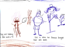As the year progressed, I noticed a shift in the students’ retellings. Students began to identify major turning points in the plot development in their responses. This was an important step in their thinking in the sense that it showed me that they were able to identify important parts of the story, even though they were not able to explain why the event was important. Reyna’s shift in thinking occurred after listening to Smoky Night by Eve Bunting (1994). She responded by not only drawing an important event from the beginning of the story, but also one from the end. Her paper was divided by a fold vertically down the middle. On the left side she drew a picture of the people rioting and stealing from the houses and businesses. She dictated, “They are taking a door and a TV.” On the right side of the paper she drew a picture of firefighters returning the cats to the young boy and his neighbor. Her dictation for this picture was, “This is when the fireman brought their cats back.” Reyna’s ability to depict two important events from one story showed me that she was beginning to think about the read alouds more deeply. She was not just thinking about which part she liked or thought was important. She was thinking about what was happening in the story and what parts were important to the central focus of the story.