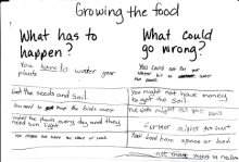 The students then broke into five small groups with each small group discussing on what had to happen and what could go wrong in the five stages of food distribution -- getting ready to grow food, growing the food, moving the food from the field, processing and selling the food, and buying, preparing and eating the food.