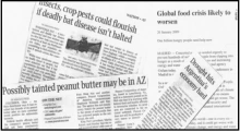 Students had been collecting newspaper articles about food or hunger and posting them on a bulletin board in the hallway. They examined a number of the articles to think about what aspect of the food distribution process was breaking down -- drought that was affecting a country’s ability to grow food, salmonella in peanut butter processing factories, farm foreclosures, and truckers unable to afford gas to transport food.
