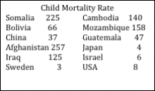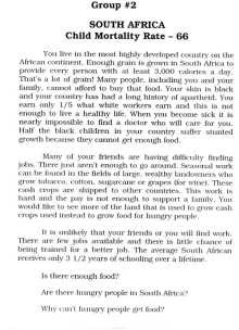 Another nonfiction text were fact cards used to support students in understanding that hunger is world wide and that food scarcity is not the primary cause of hunger. The most common myth about hunger is that people starve because there are too many mouths to feed and not enough food in the world. The reality is that there is more than enough food produced around the world to feed everyone; the issue is not the production of food but sharing that food more fairly. We borrowed and adapted an engagement from Finding Solutions to Hunger (Kempf, 2005). Students were introduced to the child mortality rate as a means of measuring the extent of the problem of hunger within countries around the world. The child mortality rate is the number of children out of 1000 who die of hunger and hunger-related diseases before the age of five. We showed students a chart of child mortality rates in ten countries and talked about what those differences meant.